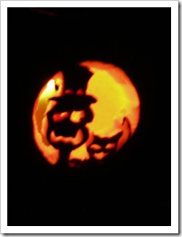 Texter wanted to carve a pumpkin. So I bought a pumpkin and a little carving kit and brought it home last Friday night. And in the middle of the kitchen floor (with a generous application of newspaper) she traced and carved for hours. She created my one and only Halloween decoration – that is if you don’t count me looking like the Wicked Witch after a day of work and school.