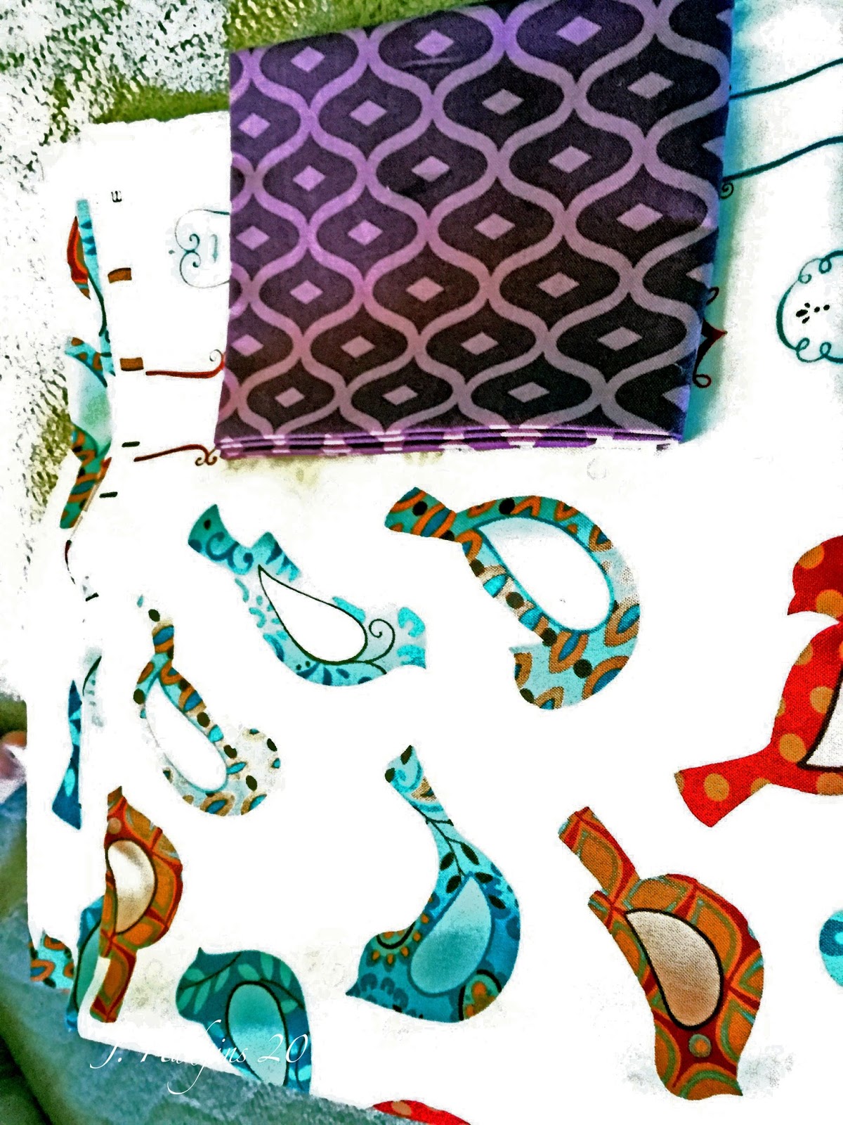 The purple fat quarter I bought because, well, it's purple and I will probably fussy cut for La Pass. Everything revolves around La Pass these days! The birds I purchased because the quilt block I am making for a group quilt. She likes bright. But once I bought it, once again, it will probably go to La Pass and I am going to use this fabric for the block. I think it's bright enough!